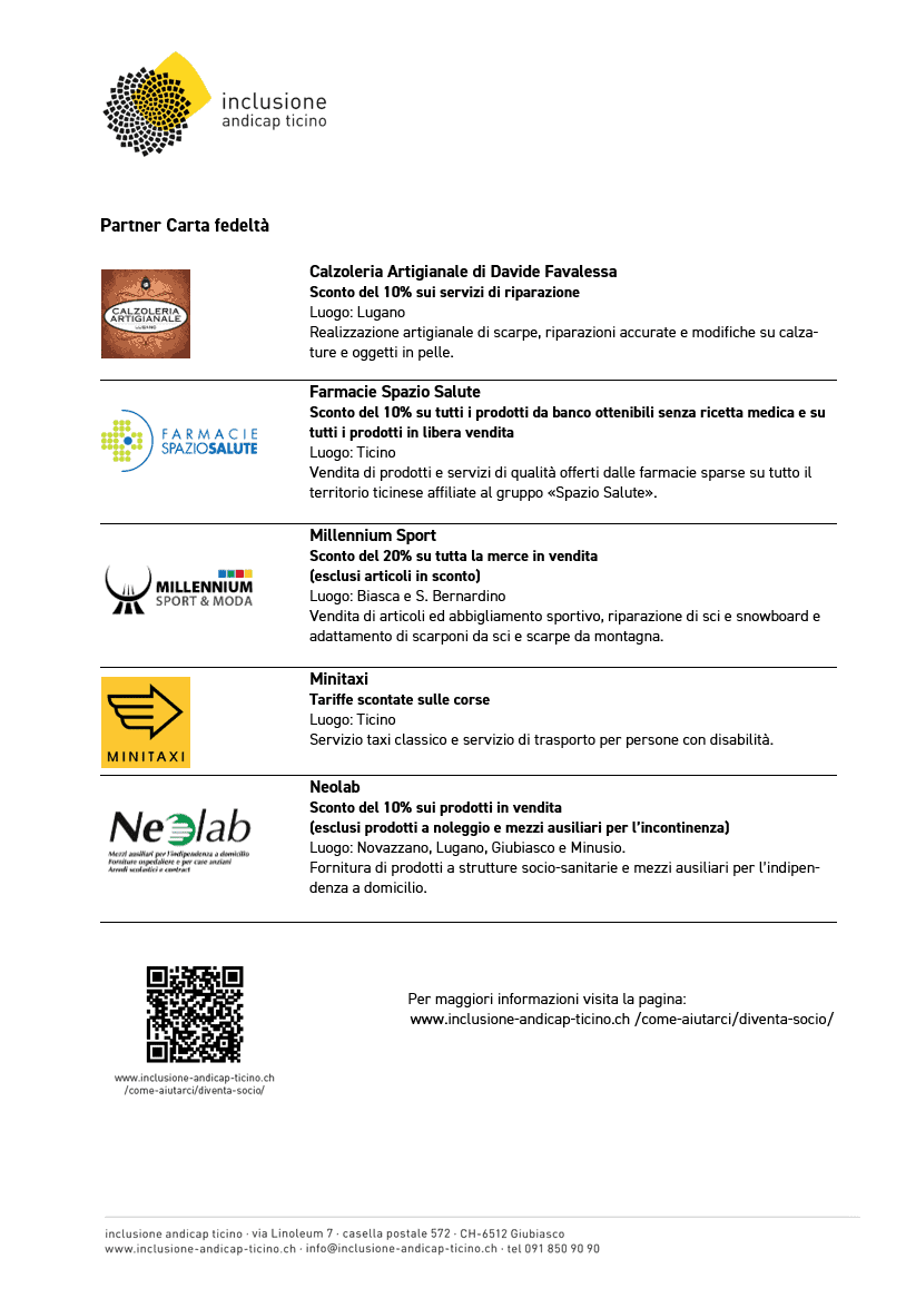 I nostri soci ricevono inoltre la carta fedeltà, la quale permette di usufruire di vantaggiosi sconti su tutto il territorio cantonale. Le aziende aderenti sono sempre in aumento, è quindi utile consultare di tanto in tanto la lista aggiornata dei partner.